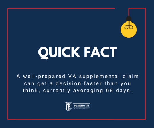 According to VA, 81% of veterans filing supplemental claims receive some form of monetary aid. Additionally, 10% of veterans filing the claim have a disability rating of 100%, which means they can receive at least $2,800 every month.